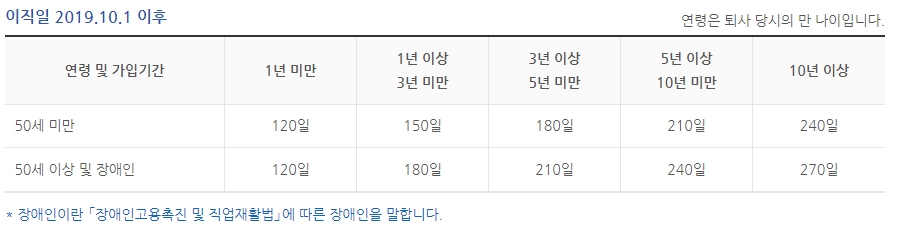 (이직일이 2019.10.1 이전은 퇴직 전 평균임금의 50% × 소정급여일수)